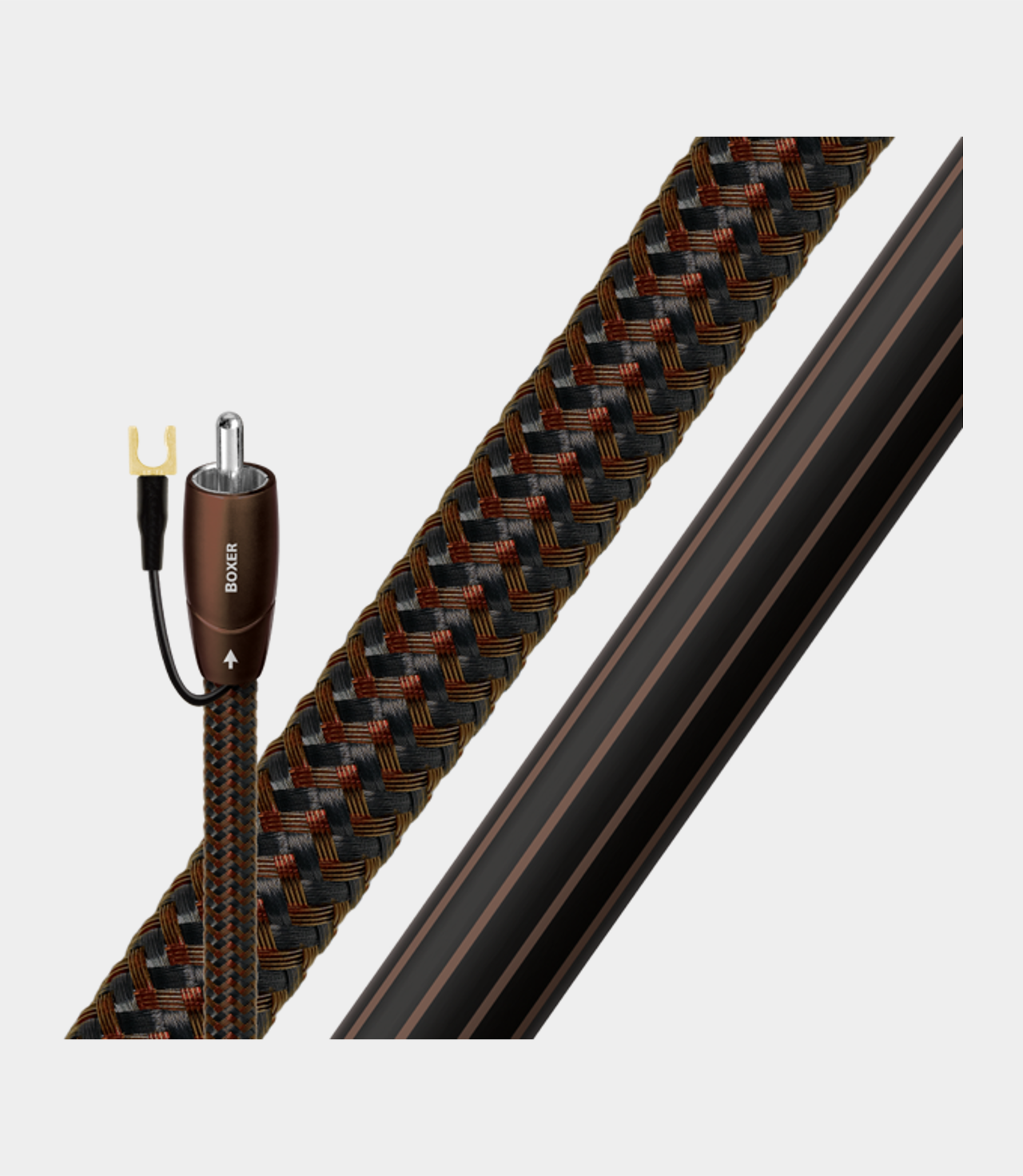 Vodiče z dlouhých vláken 1,25% stříbra: Pevné vodiče eliminují interakce mezi vlákny a chvění, běžné zdroje rušení. Pevné postříbřené vodiče jsou perfektní při použití vysokofrekvenčních signálů. Tyto signály právě pro svou vysokofrekvenčnost cestují téměř výlučně na povrchu vodiče. Protože je povrch tvořen vysoce čistým stříbrem, výkon je velmi blízko výkonu kabelu z čistého stříbra, ale cena takového kabelu se blíží spíše kabelu měděnému. Jedná se o neuvěřitelně cenově přijatelný způsob výroby velmi kvalitních subwooferových kabelů. Dutá polyethylenová izolace: jakýkoliv pevný materiál, který se nachází blízko vodiče, se ve skutečnosti stává součástí nedokonalého obvodu. Izolace kabelů a desky plošných spojů absorbují energii a způsobují ztráty, část této energie je uložena a následně uvolněna ve formě zkreslení. Boxer využívá k izolaci všech vodičů dutou polyethylenovou izolaci plněnou vzduchem, protože vzduch neabsorbuje téměř žádnou energii a polyethylen je nízkoztrátový. Výsledkem je znatelně méně zkreslený zvuk, než kdyby byly použity běžné materiály. Třívrstvý (karbonový) systém pro rozptýlení vnějších vlivů (NDS): Dokonale odstíní rušení přenášené na uzemnění přístrojů a tak zabrání pozměnění zvuku. Dvojitě vyvážená geometrie: Elektricky oddělený plášť lépe zachovává integritu negativního vodiče. Za studena svařované RCA konektory z červené mědi potažené stříbrem: Tato konstrukce konektoru umožňuje perfektní studené spojení mezi kabelem a konektorem. Toto spojení mezi konektorem a vodičem je umožněno systémem svařování za studena, které umožňuje lepší připojení a zajišťuje nedotčenou strukturální integritu vodiče. Systém svařování za studena zahrnuje kombinaci vysokého tlaku v bodě spojení a použití stříbrné pasty.