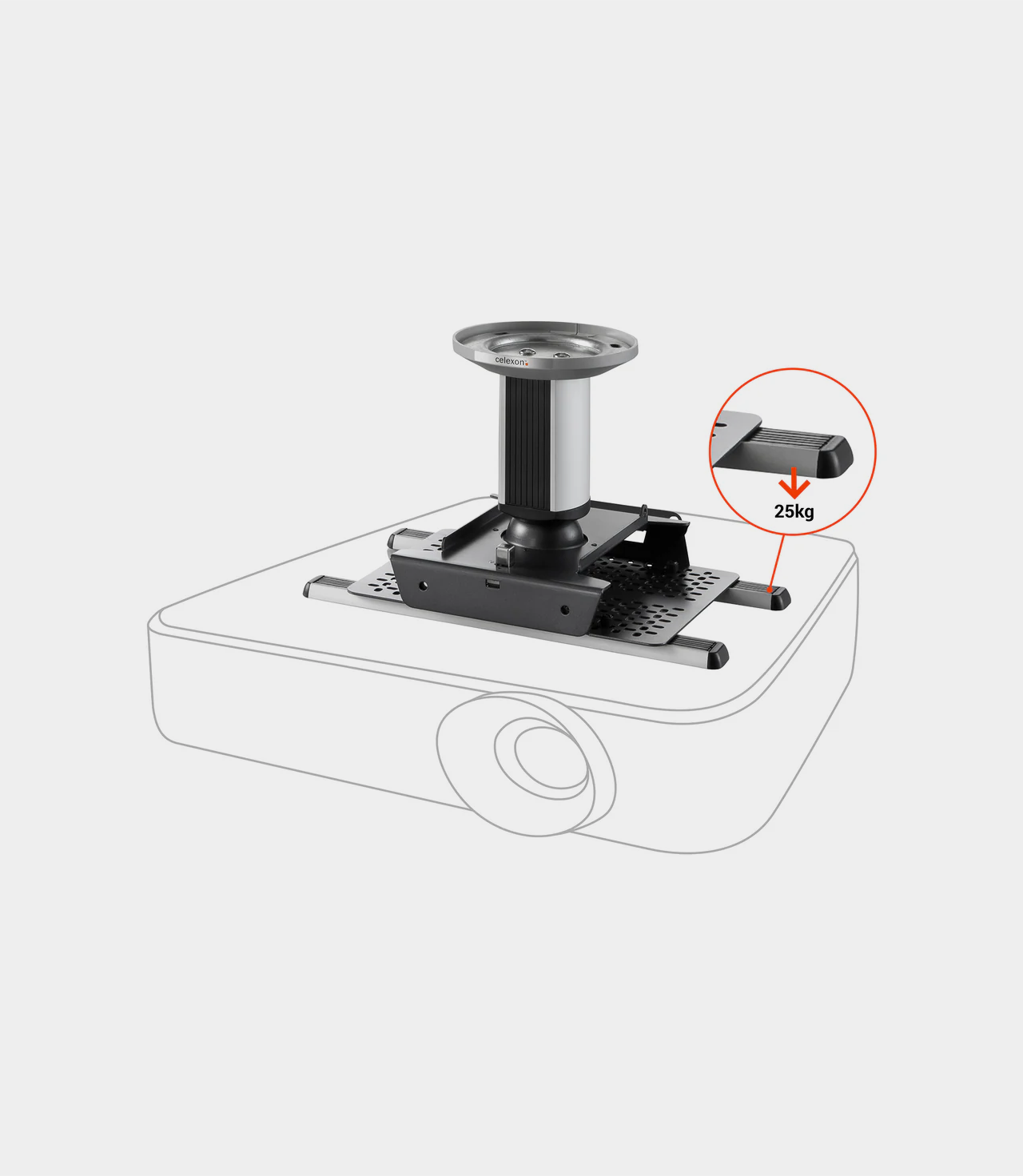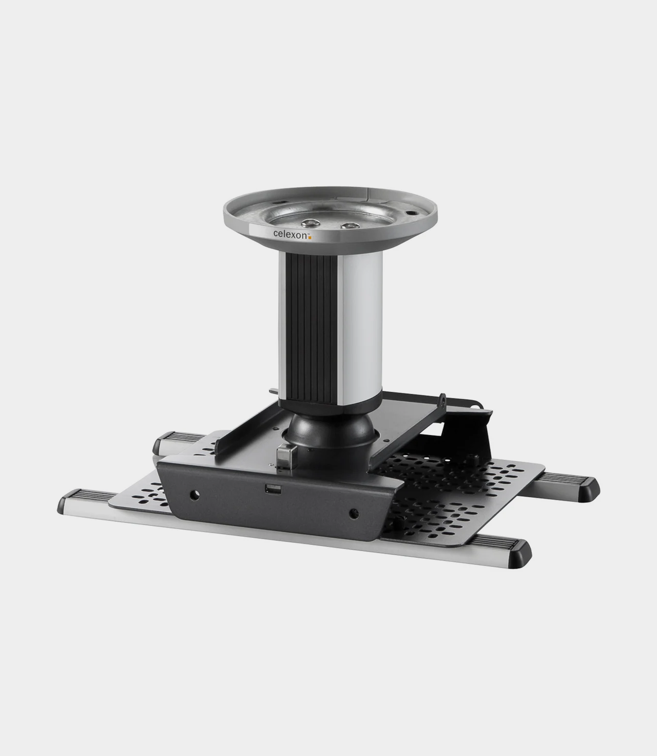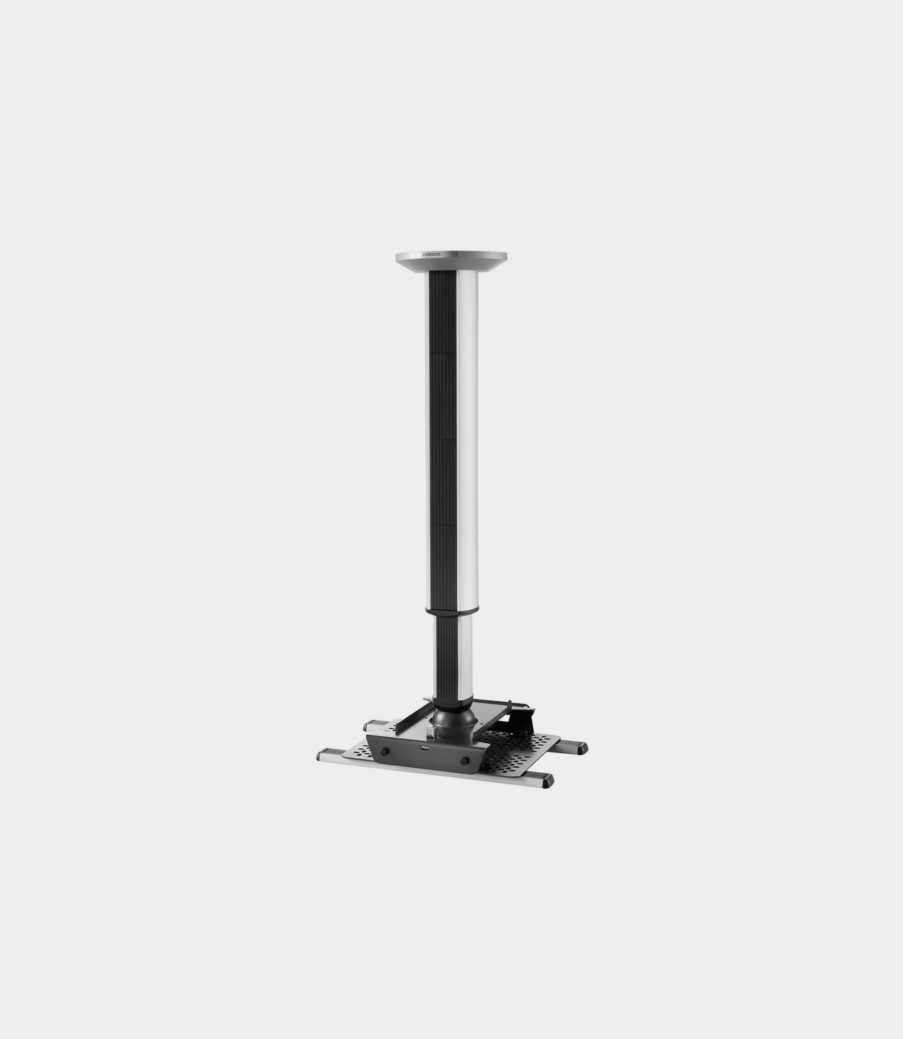 Stropní držáky Multicel ze série celexon Expert jsou nejen kompatibilní s téměř všemi běžnými projektory, ale také zaujmou svým designem a funkčností. Projektor se zde montuje pomocí univerzální projektorové desky, která zajišťuje výrazně lepší stabilitu a konzistentní vyrovnání projektoru. Díky silným prodlužovacím ramenům, která jsou součástí balení, můžete také zvětšit montážní plochu až na rozteč otvorů 25 cm – to umožňuje bezpečné a stabilní upevnění téměř jakéhokoli projektoru. Držák také nabízí možnost uvolnění projektoru z držáku pouhým stisknutím tlačítka. To nejenže výrazně usnadňuje montáž projektoru na držák, ale také nabízí možnost rychlého sejmutí zařízení a v případě potřeby jeho přemístění do bezpečí nebo údržby, např. při výměně lampy nebo filtru. Je také možné použít dva nebo více držáků pro použití projektoru na různých místech – bez nářadí a bez námahy s instalací. Tento držák nabízí variantu s fixní tyčí, kdy je vzdálenost držáku od stropu 15cm nebo s teleskopickou tyčí s variabilní vzdáleností od stropu 60 – 110cm. Maximální nosnost 25kg.