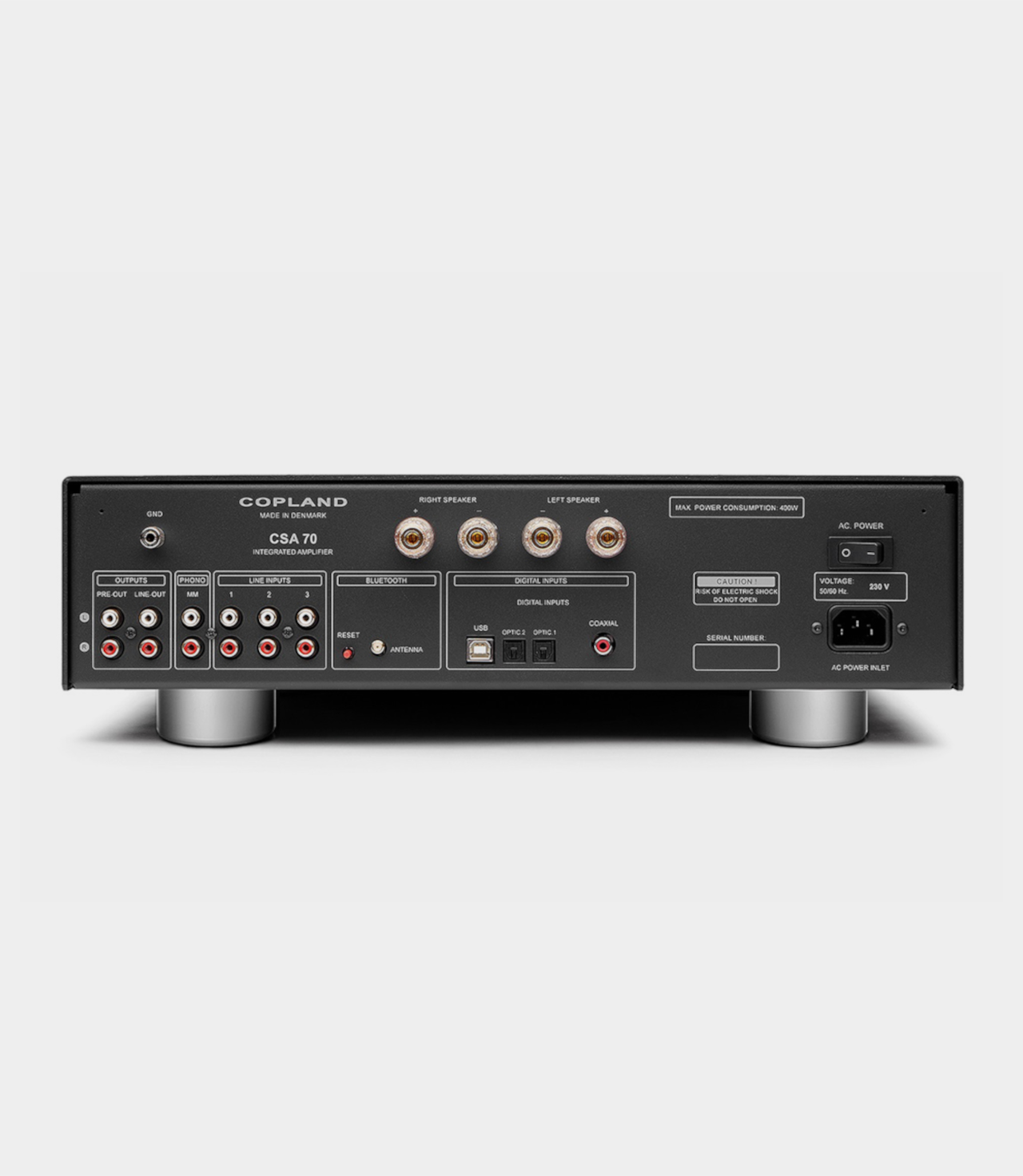 Integrovaný zesilovač CSA70 překvapí ve své cenové kategorii výjimečným zvukovým výkonem a výbavou, kterou nabízí. K dispozici jsou čtyři digitální vstupy, tři analogové vstupy, funkce linkového výstupu a také pre-out výstup. Pro vinylové nadšence je tu i vynikající phono předzesilovač pro MM přenosky. Přední panel pak mimo jiné nabídne 6,3mm výstup pro sluchátka. Zesilovač o výkonu 70W na kanál uspokojí i uživatele, kteří vlastní náročnější a hladové reprosoustavy. Na rozdíl od svých větších bratrů CSA100 a CSA150 nepoužívá CSA70 elektronky, díky čemuž je zvuk poněkud důraznější. Sekce předzesilovače se může pochlubit i mizivě nízkým zkreslením. CSA70 využívá stejnou technologii výkonového zesilovače se zpětnou vazbou jako oba vyšší modely a je tedy přirozeně rychlejší než konvenční zesilovače, přičemž disponuje obrovským frekvenčním rozsahem. Zesilovač je robustně zkonstruován a navržen tak, aby se vypořádal i s extrémními dynamickými zátěžemi.
