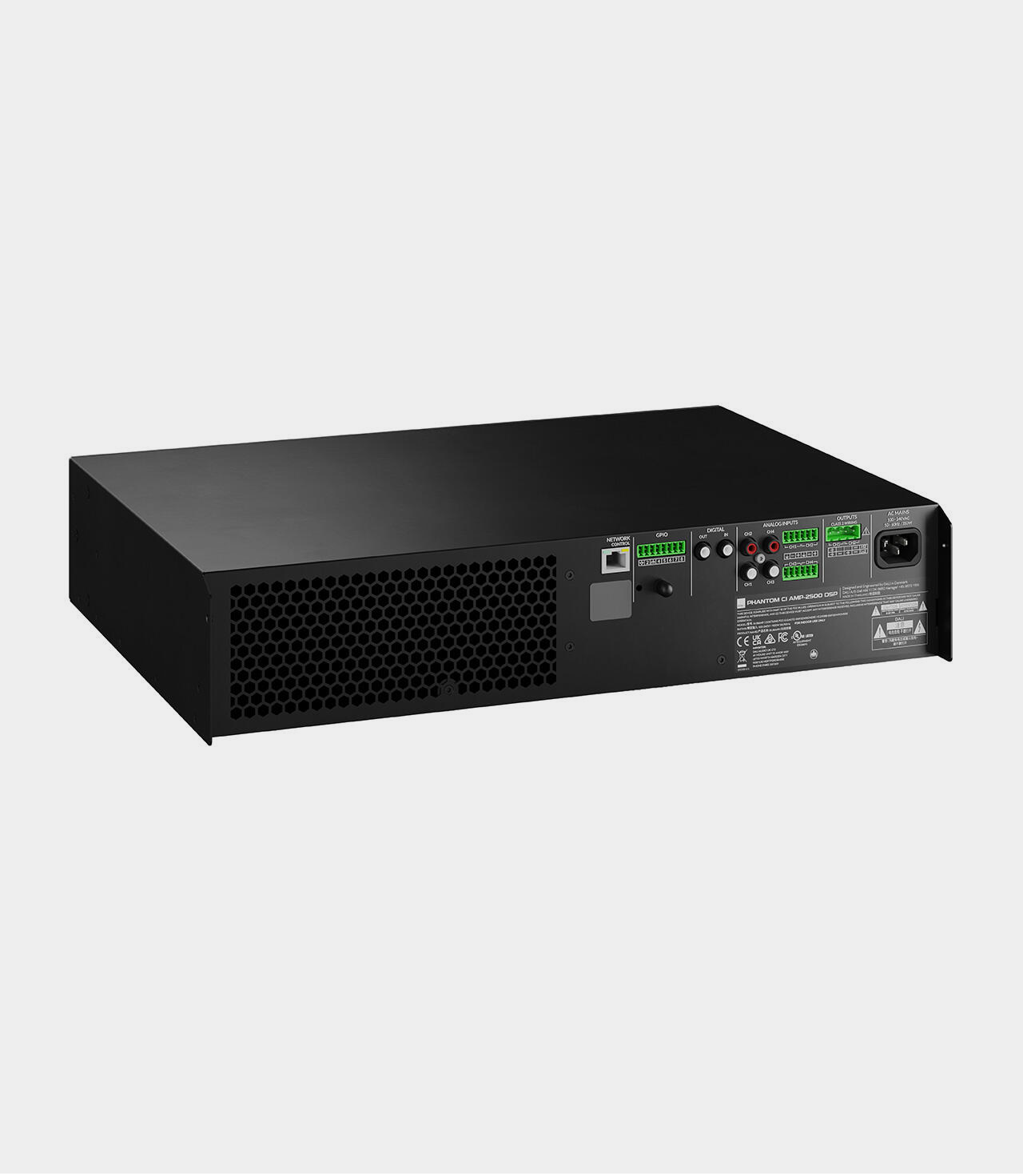 Instalační zesilovač PHANTOM CI AMP-2500 DSP s výkonem 2 x 500W třídy D se vyznačuje bezproblémovým výkonem, extrémně vysokou účinností a velmi nízkým zkreslením. Tento rackový zesilovač lze také přemostit na mono zesilovač s výkonem 1.000 W. S takovým výkonem je CI AMP-2500 DSP dokonalým zdrojem energie pro série PHANTOM S a M a až čtyři nástěnné subwoofery PHANTOM IW SUB S-100. Je možné jej umístit do racku a je vybaven adaptivní regulací ventilátoru, která snižuje hluk ventilátoru na minimum. Zesilovač je také vybaven plně funkčním DSP (Digital Signal Processing) a webovým rozhraním konfigurátoru. Díky vestavěnému DSP je přizpůsoben prostřednictvím přednastavení specifických pro daný model tak, aby optimalizoval modely DALI CI a zajistil tak nejlepší možný zvukový zážitek ve vaší audioinstalaci.