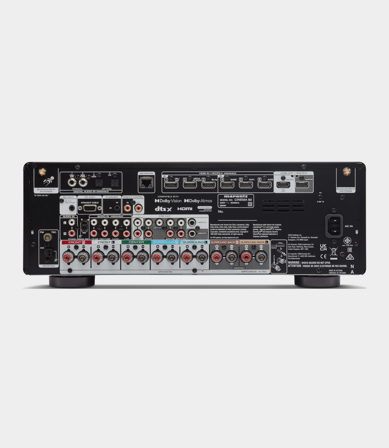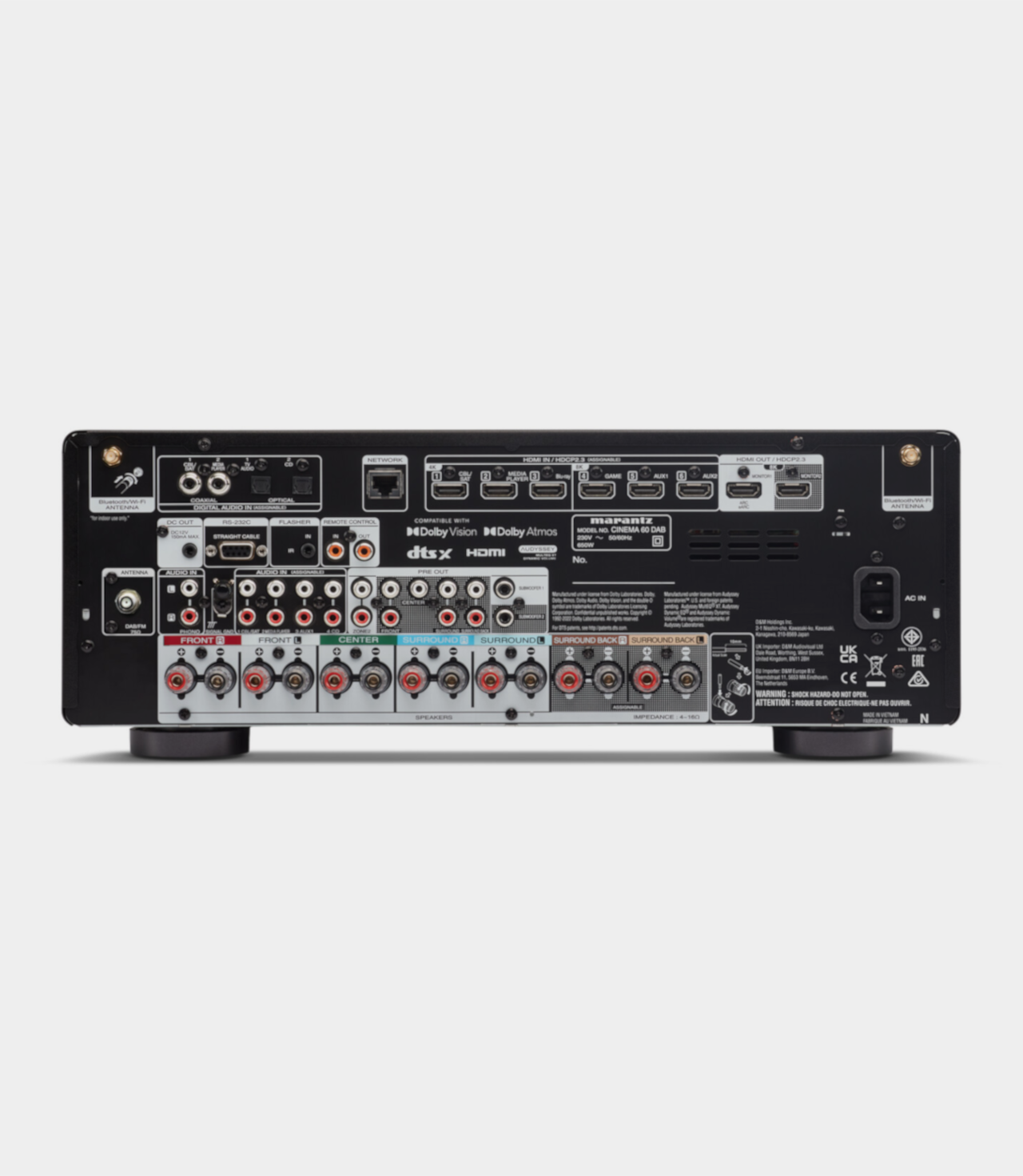 Tento 7.2 kanálový AV receiver se schopností zesílit 7 kanálů, nabízí dokonalý zážitek z domácího kina s Dolby Atmos, DTS: X nebo DTS Neural:X a bezkonkurenční možnosti přehrávání hudby díky vestavěné technologii HEOS, AirPlay 2 a kompatibilitě s hlasovým ovládáním Amazon Alexa, které lze využít i pro bezproblémové ovládání přehrávání. Technologie HEOS umožňuje poslech nahrávek ve vysokém rozlišením (až po DSD 5.6) z vašeho síťového úložiště nebo nejnovějších streamovacích služeb Spotify, Tidal a dalších. Mimo to systém HEOS umožňuje multiroom ozvučení z podporovaných komponentů značek Marantz nebo Denon. Cinema 60 dokáže obsloužit až 2 zóny. Možnost volby mezi variantou s AM/FM tunerem a DAB+ tunerem.