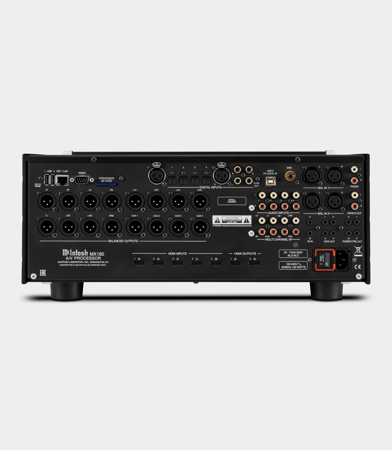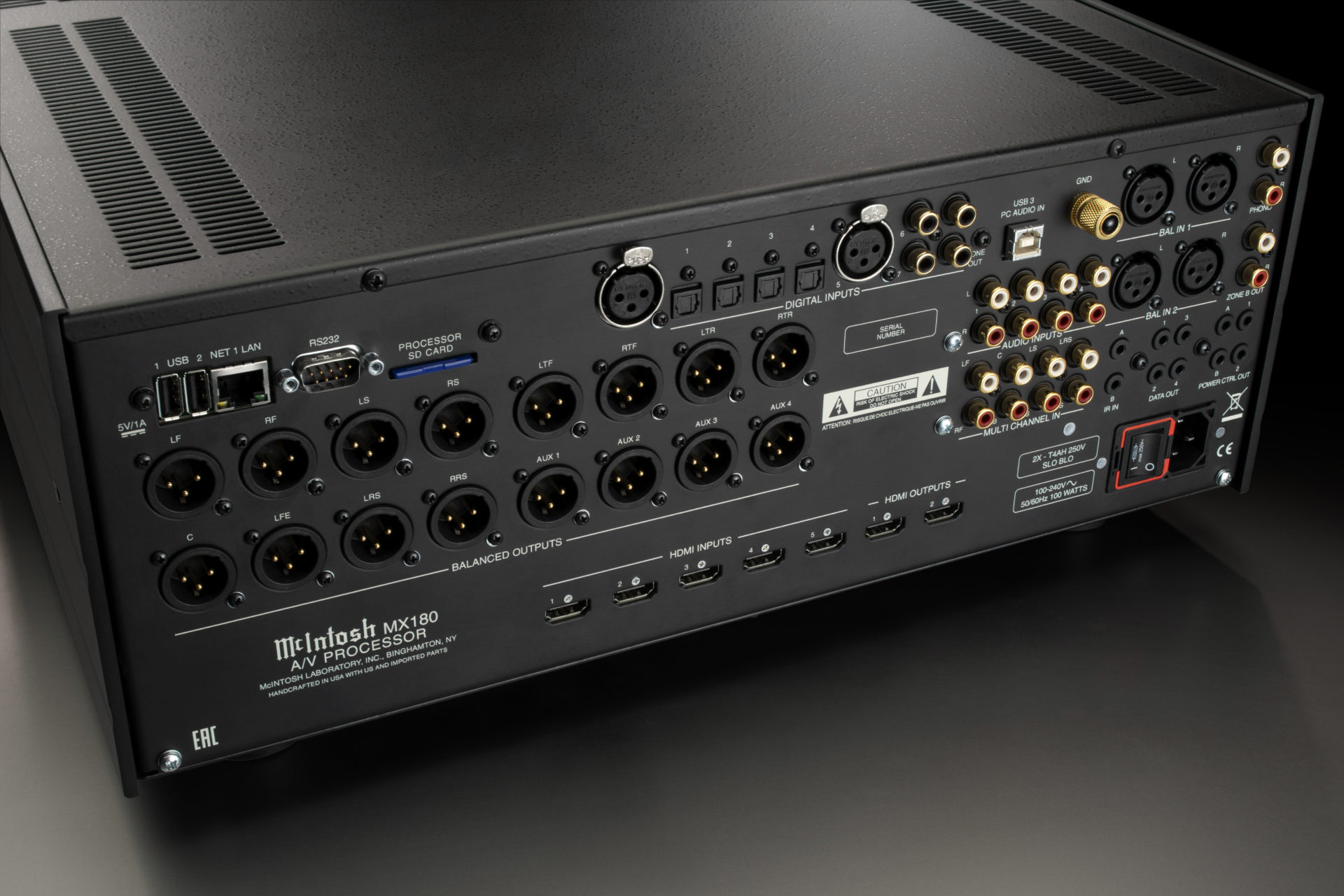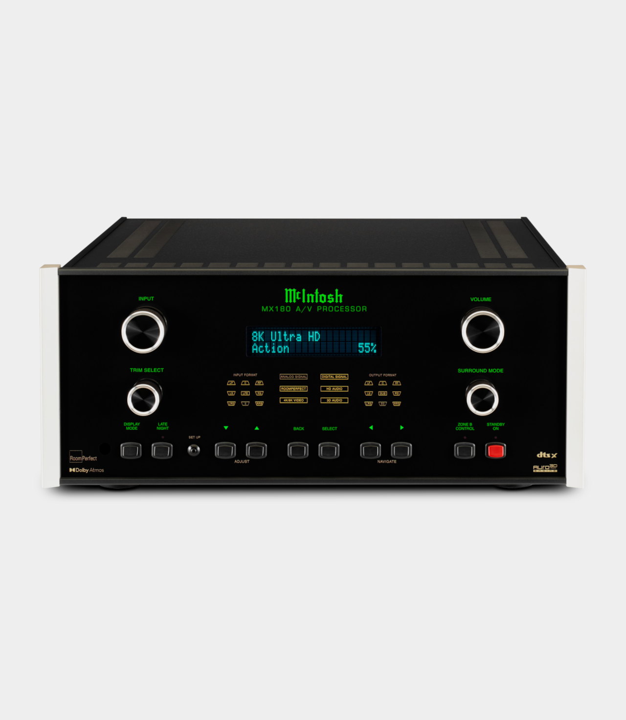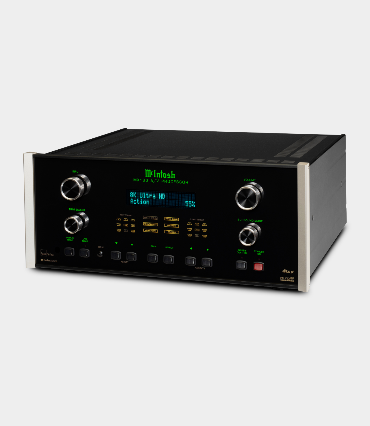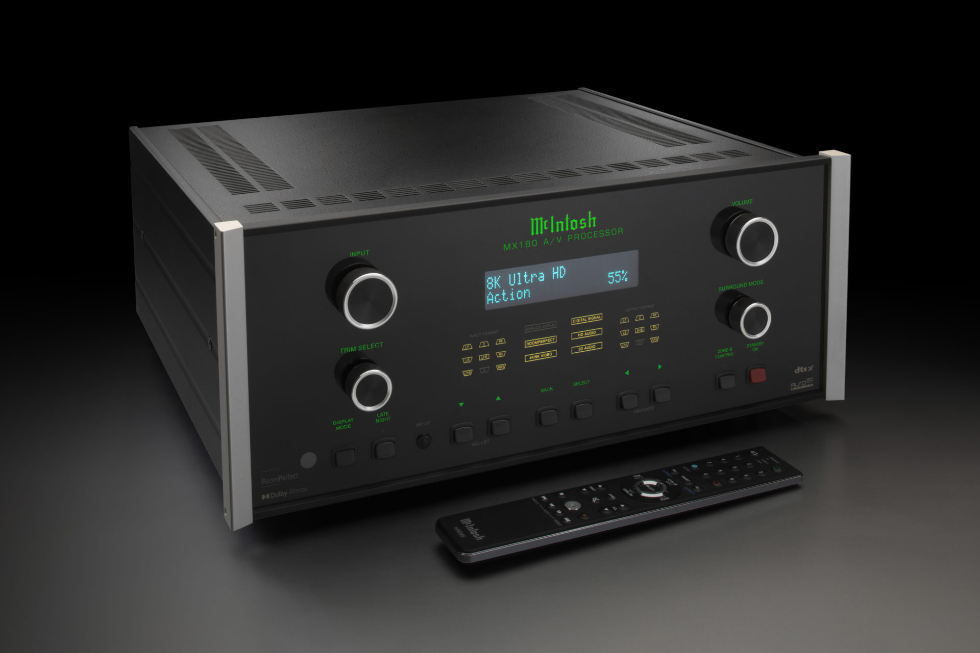 MX180 představuje špičkový 15.1 kanálový AV procesor pro highendová domácí kina. Nabídka dekodérů prostorového zvuku je víceméně kompletní včetně objektově orientovaných 3D formátů. Automatické přizpůsobení poslechové místnosti RoomPerfect. MX180 podporuje rozlišení 8K/60Hz a 4K/120Hz na všech sedmi HDMI portech (pět vstupních, dva výstupní). Každý z nich podporuje HDCP 2.3; 4:4:4 barvy; Rec. 2020; dynamickou synchronizaci zvuk/obraz a rychlé přepínání médií (QMS). Výstupní HDMI mohou buď současně vysílat stejný zdrojový signál na dvě samostatné obrazovky, nebo mohou současně vysílat různý obsah, ze dvou různých zdrojů, na dvě samostatné obrazovky. D/A převodník na digitálních vstupech podporuje signály PCM až do 192 kHz a 24 bitů. Zvuk lze upravovat i tónovými korekcemi basů a výšek s nastavitelnými kmitočty. Dálkovému ovladači konkuruje aplikace pro chytré telefony a tablety.