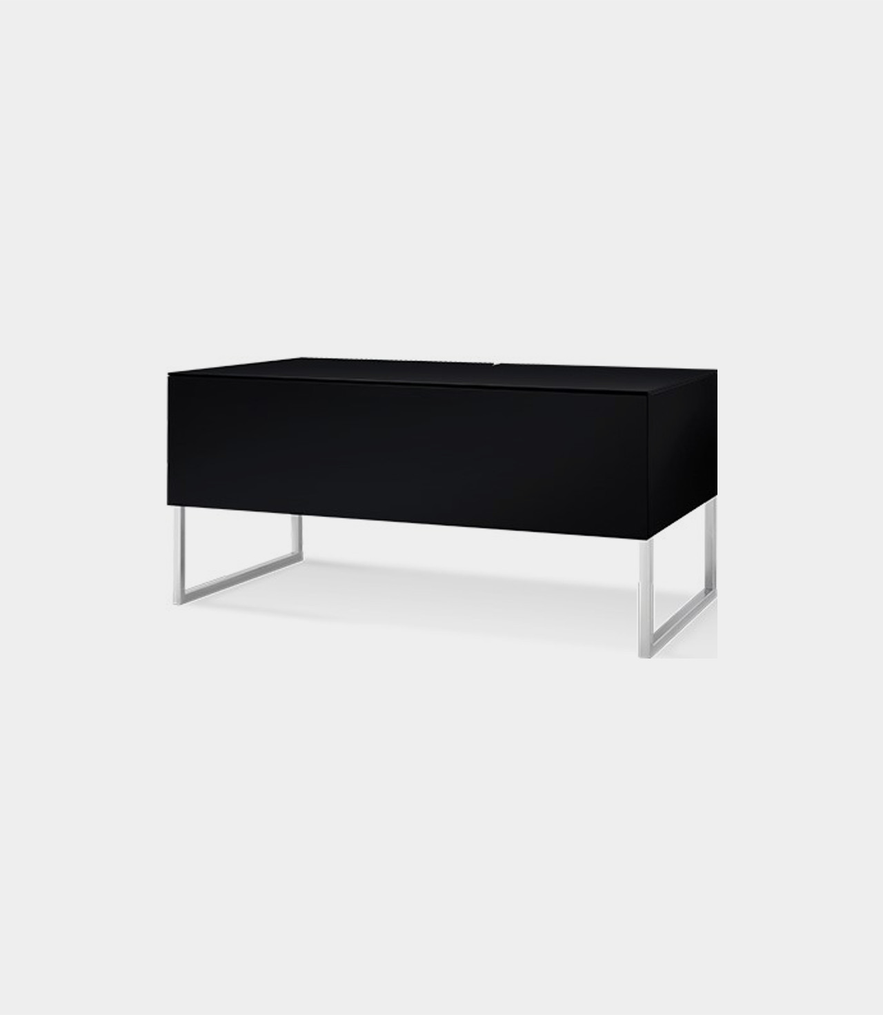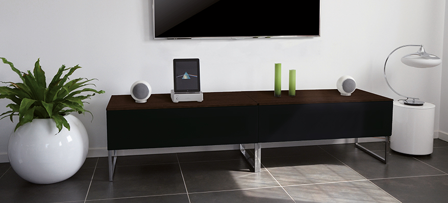 Stylový AV stolek, který může stát na elegantních chromovaných nohách nebo být zavěšen na stěně. Jeho sklopný čelní díl je schopný propouštět infračervený signál z dálkového ovládání. Horní deska a zadní díl jsou uzpůsobeny pro čisté vedení kabelů. Stolky mohou být poskládány vedle sebe, přičemž celek působí velmi čistě a pojme veškeré AV přístroje vaší sestavy hifi nebo domácího kina.