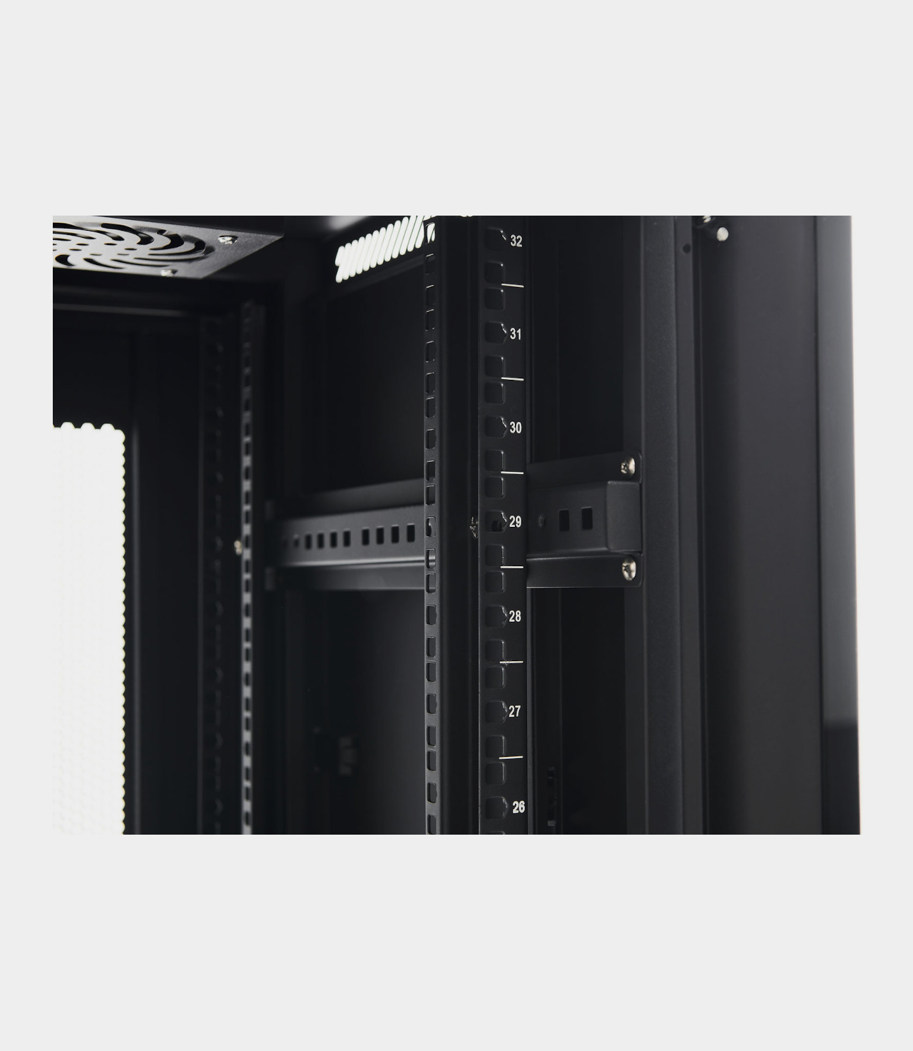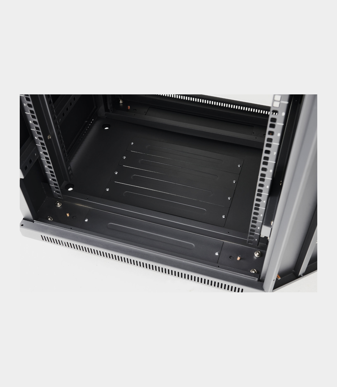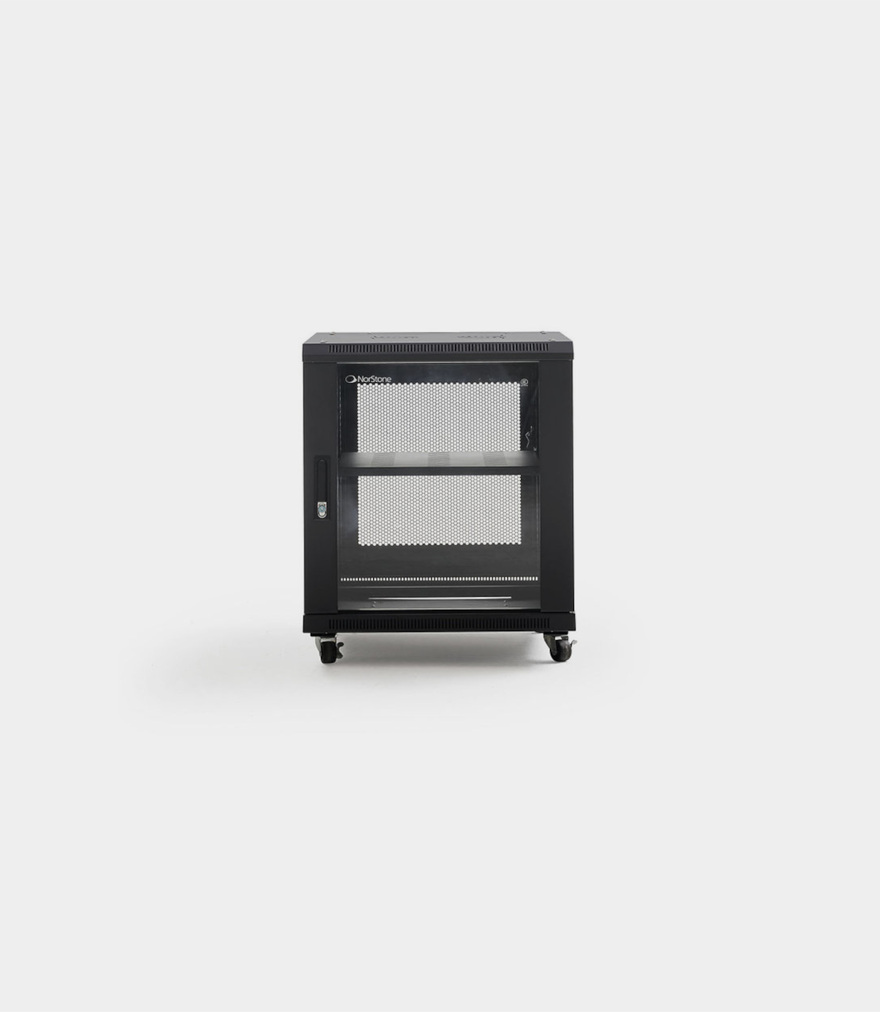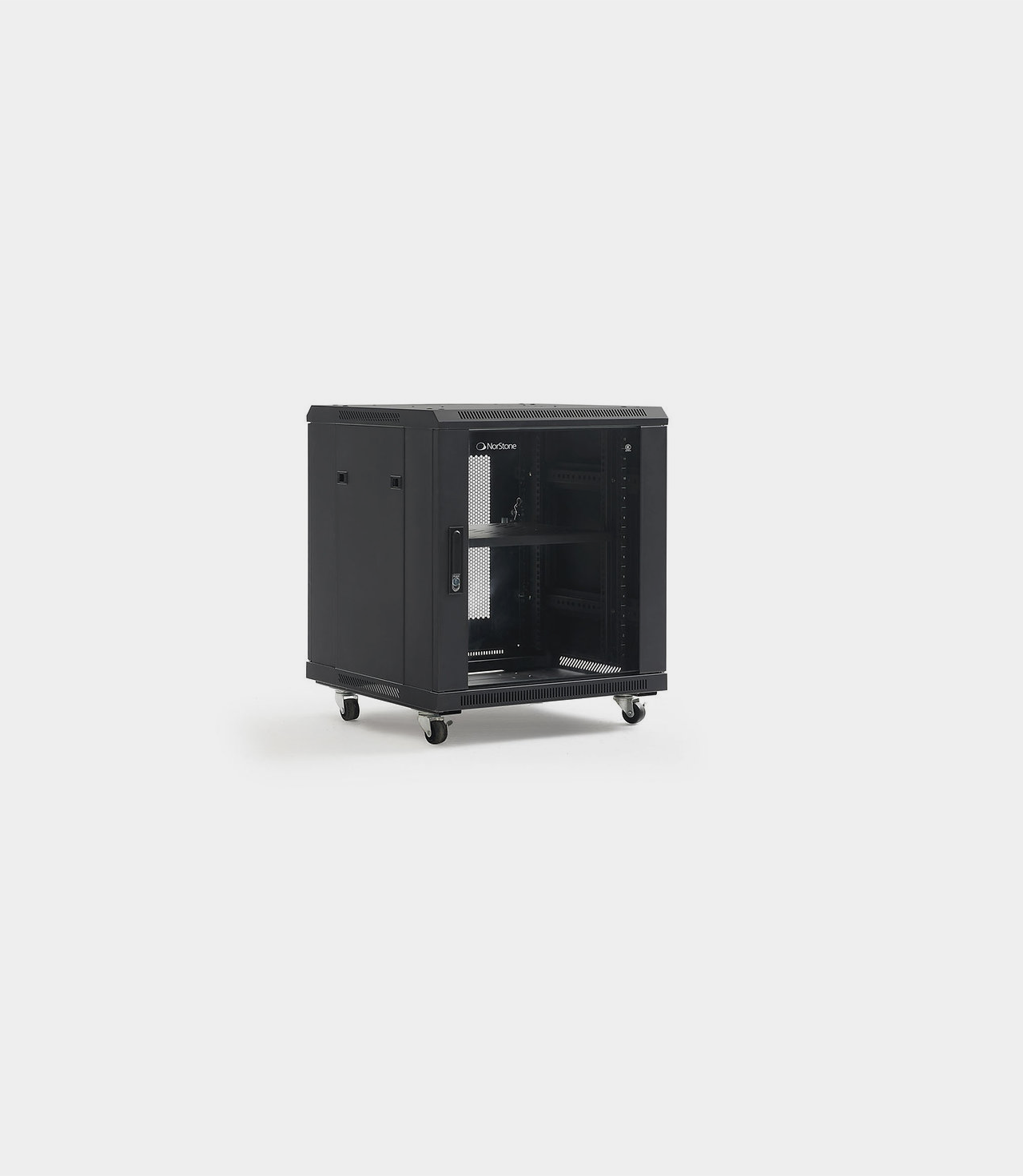 NorStone 12U je robustní a funkční úložné řešení určené pro umístění až 12 jednotek 19“ zařízení. Tento rack je ideální pro profesionální prostředí, kde je nezbytná organizace a ventilace zařízení. Je vybaven integrovanými ventilačními mřížkami na horní straně, včetně dvou ventilátorů pro optimální řízení teploty. Odnímatelné boční panely usnadňují instalaci a kabeláž, zatímco perforované čtvercové otvory umožňují snadné použití s nasazovacími klecovými maticemi. Dveře z tvrzeného skla, vybavené zámkem na klíč a motýlkovou rukojetí, poskytují jak bezpečnost, tak estetický vzhled. Rack je navíc namontován na 80mm kolečkách a výškově nastavitelných nožkách pro lepší mobilitu a stabilitu. Maximální nosnost police 30kg.