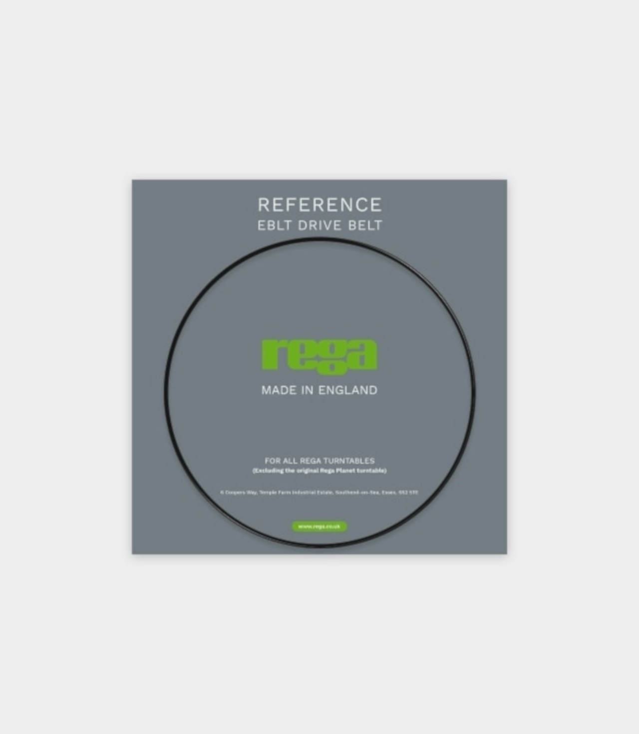 Tento referenční řemínek pro gramofony Rega je vyvrcholením mnoha let výzkumu a vývoje a jde o doposud nejpřesnější hnací řemínek, jaký Rega vyrobila. Reference EBLT je standardně osazen na modelech gramofonů Planar 8 a Planar 10, je však vhodný pro všechny gramofony Rega, zejména pro Planar 6 a Planar 3 s napájecím zdrojem Rega Neo TT. Každý řemínek je vylisován na vysoce přesných zakázkových strojích pomocí jedinečné tajné směsi. Jakmile je řemínek vytvarován, je kryogenicky zmrazen a válcován, aby se odstranila přebytečná hmota a byl vytvořen dokonale kruhový průřez, která je stěžejní pro přesnou rychlost a stabilitu otáček. Při běžném používání a podmínkách je životnost hnacího řemínku EBLT o 50% delší než u předchozího modelu. Každý řemínek Reference EBLT prochází unikátním procesem vytvrzování, který zaručuje nejvyšší dosažitelnou úroveň přesnosti.