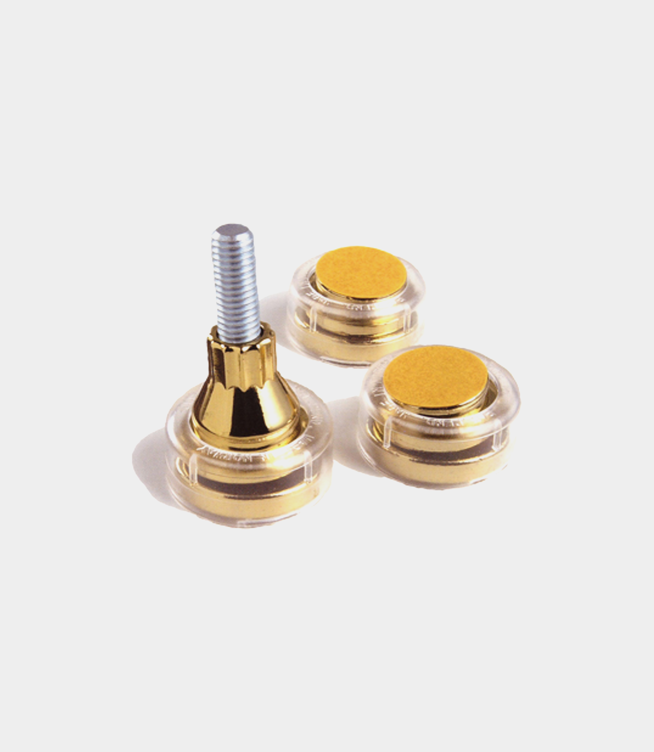 Antivibrační a odhmotňovací nalepovací podložky pod reprosoustavy. Snadná instalace. Dodáváno s filcovými podložkami proti poškrábání. Soundcare HE Self jsou velmi exkluzivní podložky pro ty, kteří chtějí něco zvláštního. Jsou ručně vyráběny v Norsku a představují vrchol nabídky tohoto norského výrobce. Zinkové části jsou pokryty vrstvou mědi, chromu a zlata. Plastové pouzdro je vyrobeno z čirého polykarbonátu. Sada obsahuje 3 kusy.