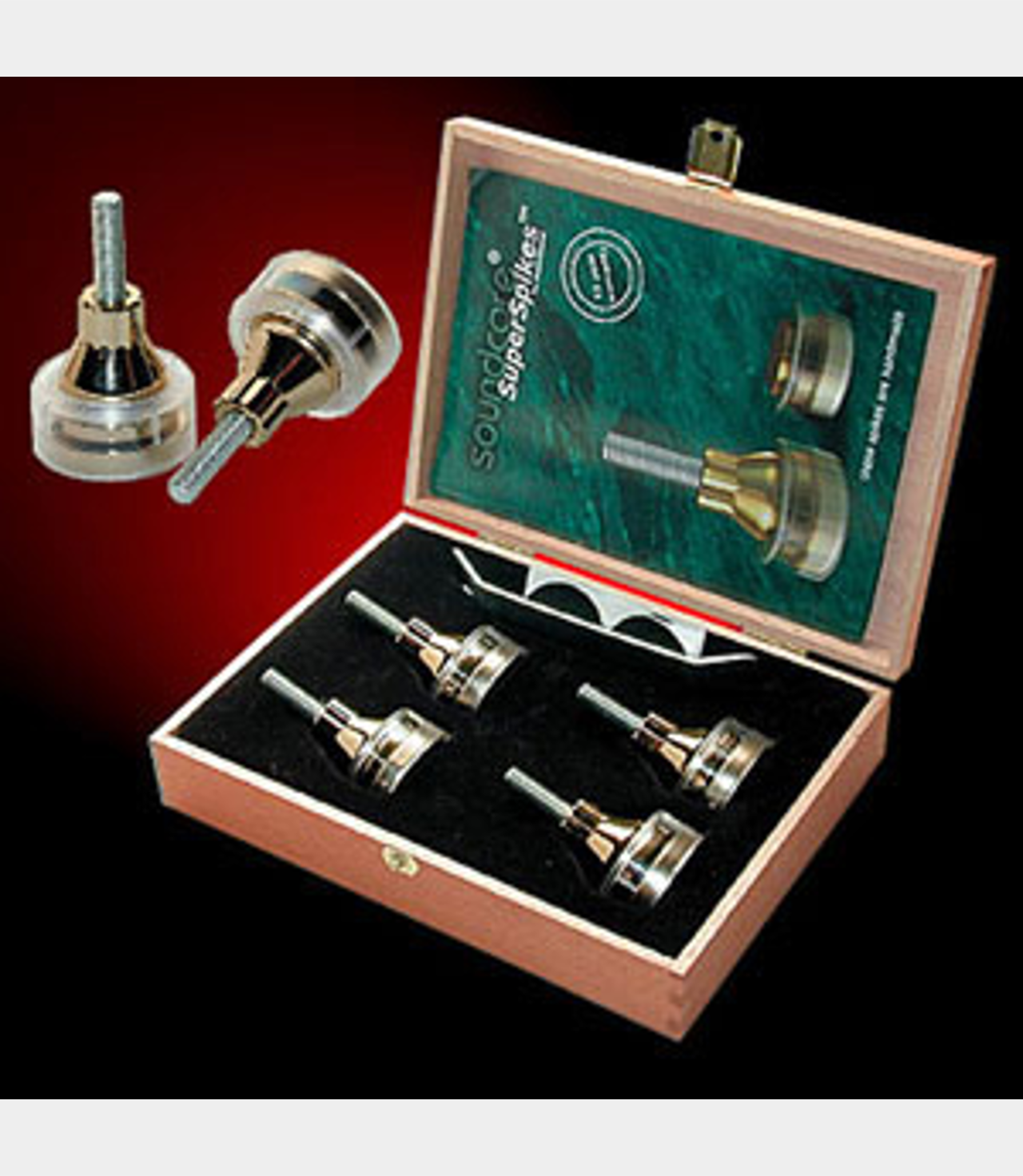 Antivibrační a odhmotňovací hroty SuperSpikes HE jsou velmi exkluzivní hroty pro ty, kteří chtějí něco zvláštního. SuperSpike High-End jsou ručně vyráběny v Norsku. Zinkové části jsou pokryty vrstvou mědi, chromu a zlata. Plastové pouzdro je vyrobeno z čirého polykarbonátu. Soundcare High-End SuperSpike představují vrchol nabídky tohoto norského výrobce. Určeno pro závit M8. Sada obsahuje 4 kusy.