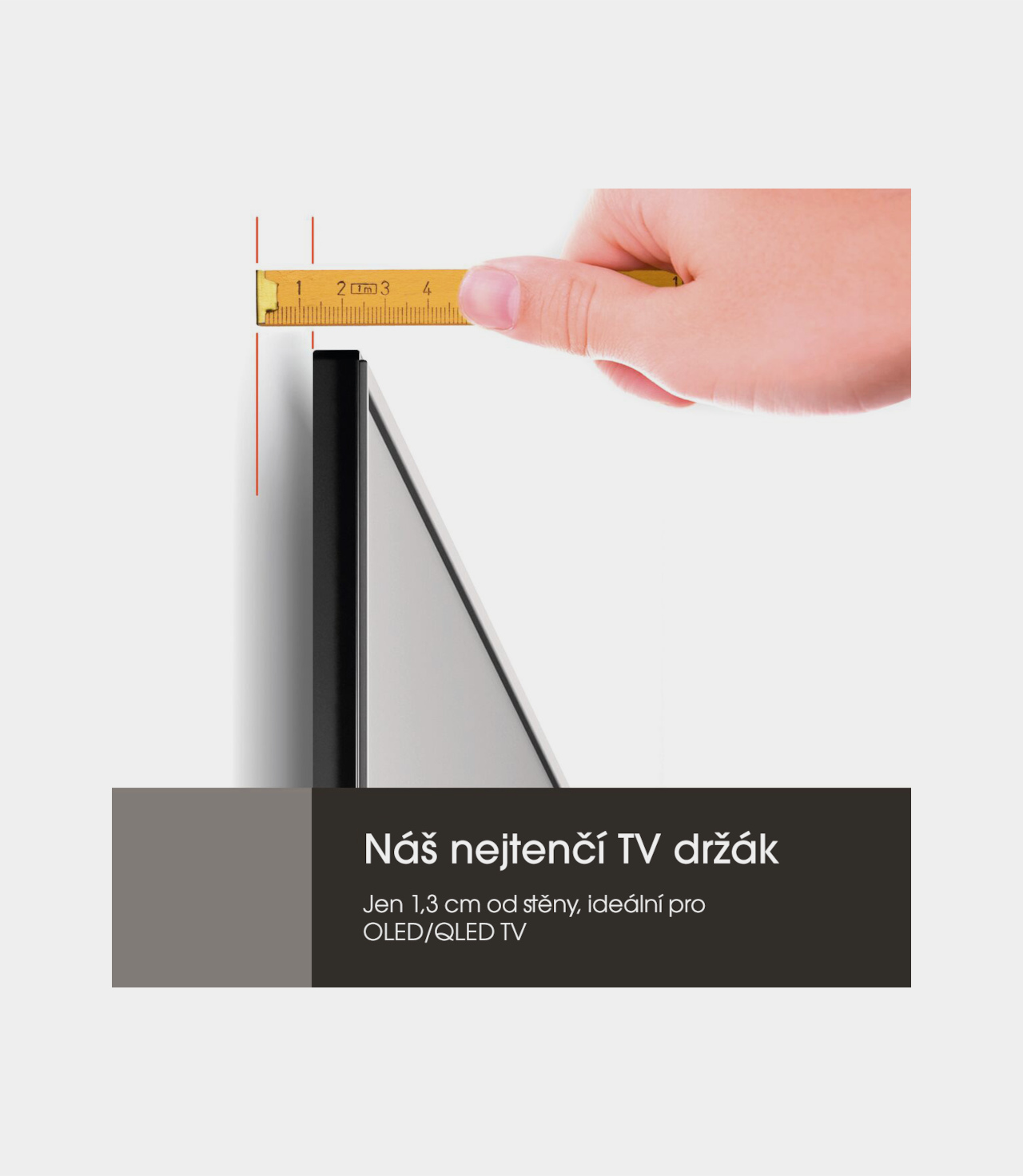 Nástěnný držák pro televizory s úhlopříčkou 32-77″. TVM 5505 je ideálním řešením pro ty, kteří chtějí svůj velký televizor s hmotností až 75 kg pevně a bezpečně připevnit na zeď. Díky hloubce držáku pouhých 1,3 cm vypadá váš televizor na stěně jako umělecké dílo. Držák kombinuje styl, pevnost a snadné použití. Díky jedinečnému systému GuidanceSystem přesně vidíte, kam musíte televizor při zavěšování umístit. Televizor jednoduše připevněte k nástěnné desce. Vylepšený mechanismus zacvaknutí televizor bezpečně udrží na místě, aniž byste jej museli později složitě demontovat. A díky bočnímu zámku je televizor chráněn před nechtěnými pohyby, i když do něj někdo narazí.