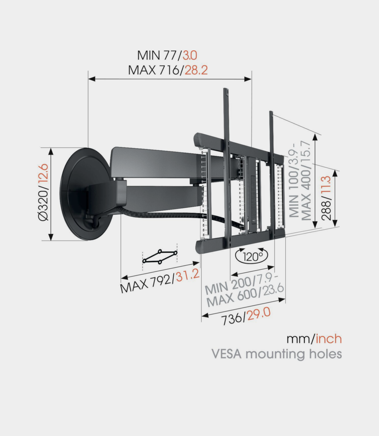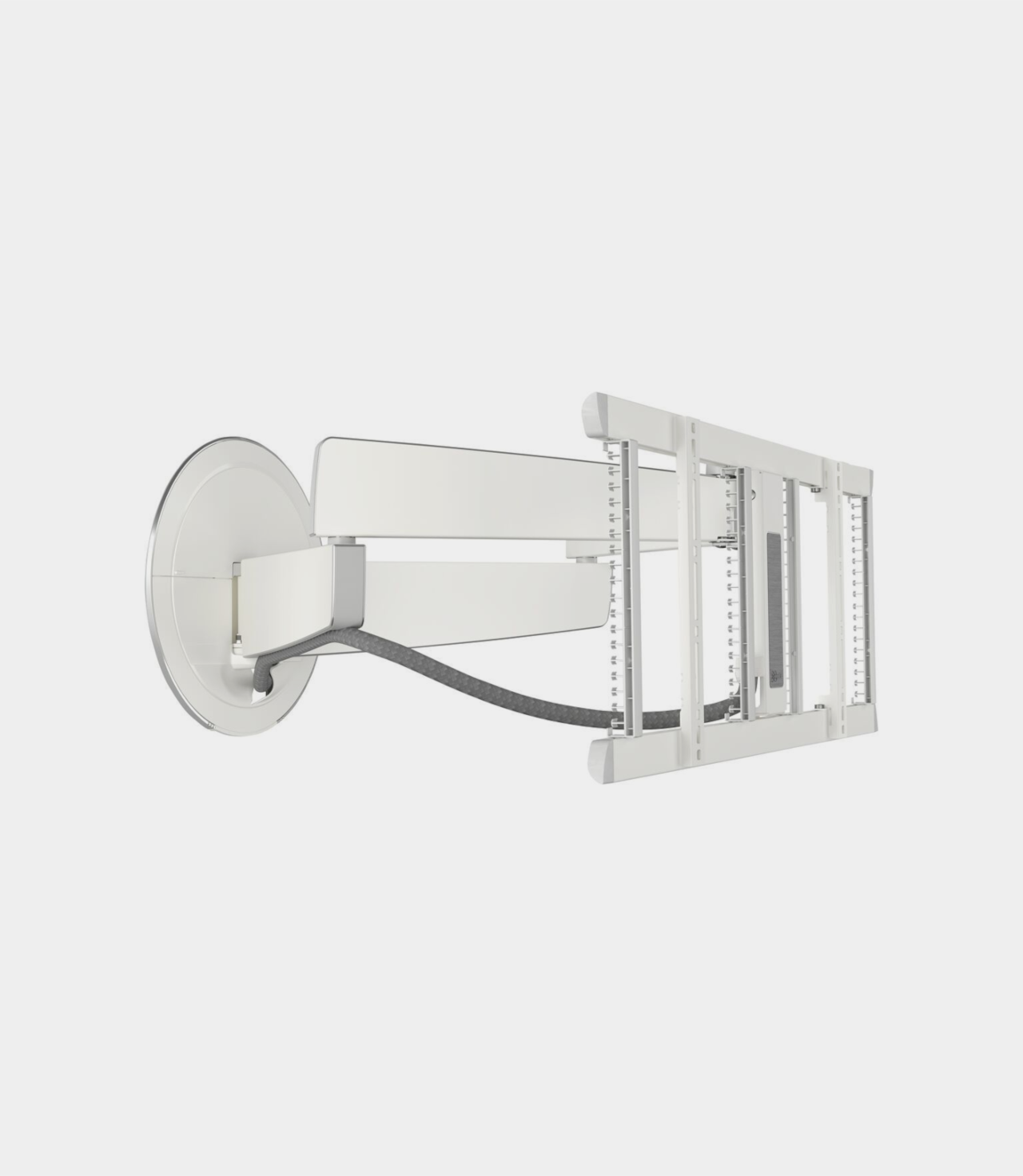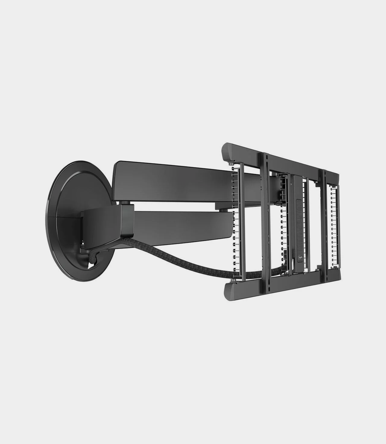 Velmi stabilní dvouramenný držák pro televizory s úhlopříčkou 40“- 77“. Umožňuje natočení až o ±60 stupňů a poskytuje tak ideální sledování TV z jakéhokoliv místa v pokoji. Patentovaný systém umožňuje snadný pohyb pouhým dotykem konečky prstů. Stylovému čistému vzhledu napomáhá možnost uspořádání kabelů. Obě ramena nabízí prostor pro vedení kabelů. SPS (Screen Protection System) – bez ohledu na to, jak TV natočíte, vždy si můžete být jisti, že s ní nenarazíte do stěny. K držáku se nabízí další příslušenství v podobě lišty pro vedení kabelů, který na držák perfektně navazuje a slouží i k uchycení polic z černého bezpečnostního skla. Maximální nosnost 35kg. Vesa uchycení do 600x400mm.